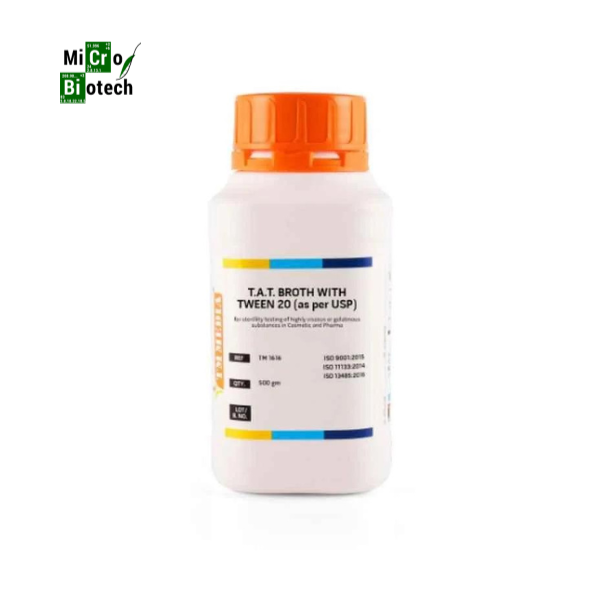 Bouillon TAT avec tween 20 500 g TM Media pour les tests de stérilité de substances très visqueuses ou gélatineuses en cosmétique et pharmaceutique. Préparé selon la formule recommandée par la Food and Drug Administration des États-Unis et la Pharmacopée américaine pour l’enrichissement, l’isolement et la culture de bactéries à Gram négatif dans les cosmétiques, les médicaments tropicaux et les tests de stérilité des substances visqueuses ou gélatineuses.