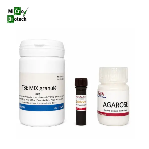 Ce kit d’électrophorèse réunit des composants essentiels pour la séparation et la détection des acides nucléiques. Il inclut un agarose de grade biologie moléculaire, purifié et exempt de DNase, RNase et protéase, qui assure une séparation nette et performante de l’ADN et de l’ARN. Il contient aussi un mélange TBE granulé, solution prête à l’emploi qui stabilise les conditions de migration lors des analyses sur gel. Le kit intègre également le GoldView, un colorant moderne et sûr qui remplace le bromure d’éthidium, avec une sensibilité élevée pour visualiser l’ADN et l’ARN sous UV. Ce Kit d’électrophorèse complet garantit des résultats fiables, précis et adaptés aux exigences des laboratoires de biologie moléculaire.
